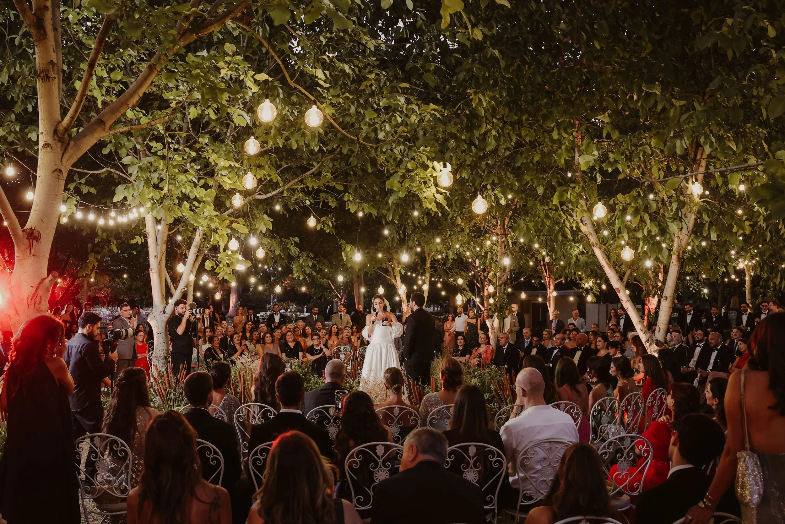 This outdoor wedding unfolded like a timeless soirée, where lush greenery, curated tablescapes, and soft lighting transformed the space into a refined garden escape. Guests dined under the trees, surrounded by layered textures, natural tones, and subtle elegance.